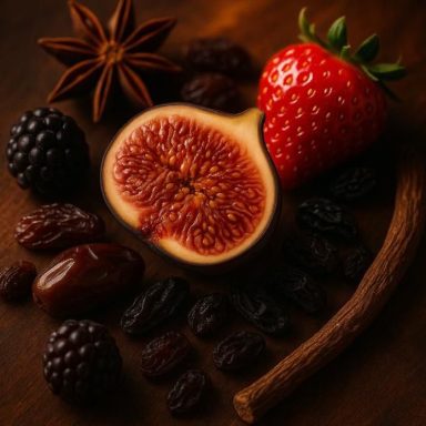 A fruity woody accord with black raspberry, date, fig, raisin, and strawberry with uplifting soft spices. With a hint of liquorice.